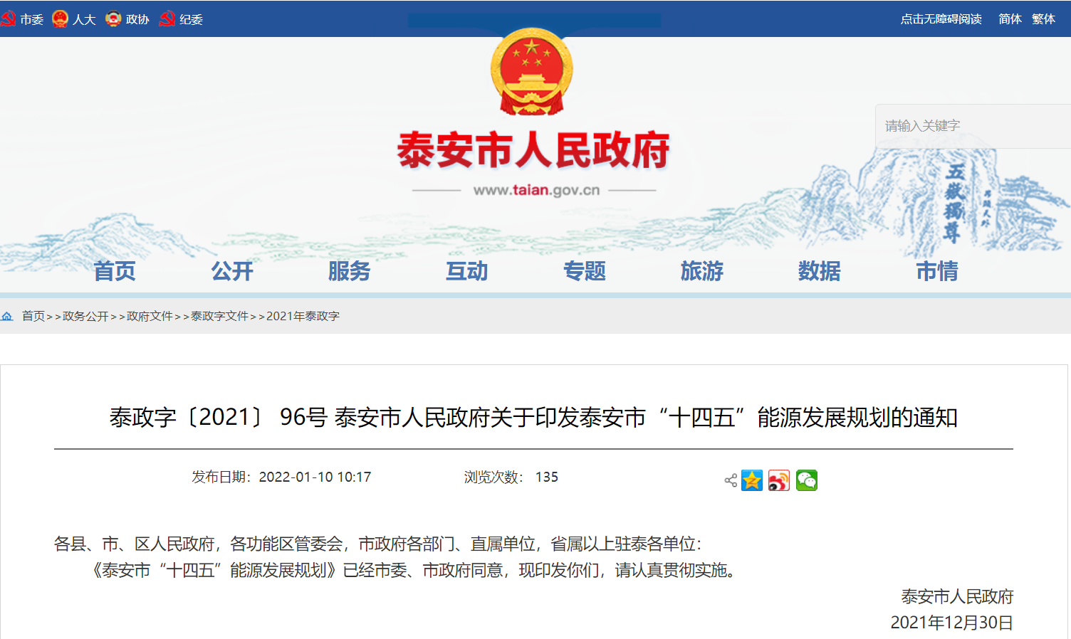 近日,山東省泰安市人民政府印發(fā)《泰安市“十四五”能源發(fā)展規(guī)劃》(以下簡稱《規(guī)劃》)。“十四五”期間,泰安市圍繞堅持“創(chuàng)新驅(qū)動、綠色低碳、效率優(yōu)先、多元互補、智能共享”的基本原則,加快構(gòu)建清潔低碳、安全高效的現(xiàn)代能源體系,深入推進能源生產(chǎn)和消費方式變革,進一步促進全市現(xiàn)代能源經(jīng)濟高質(zhì)量發(fā)展。