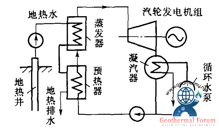 雙循環(huán)地?zé)岚l(fā)電系統(tǒng)是利用地下熱水來加熱某種低沸點工質(zhì),使其進(jìn)入汽輪機(jī)工作的地?zé)岚l(fā)電系統(tǒng),又稱中間介質(zhì)法或低沸點工質(zhì)循環(huán)。它是為克服閃蒸地?zé)岚l(fā)電系統(tǒng)的缺點而出現(xiàn)的一種循環(huán)系統(tǒng)。地下熱水用深井泵抽到地面進(jìn)入電站內(nèi)的蒸發(fā)器,加熱某一種低沸點介質(zhì)(如氟里昂11、氯乙烷等),使之變?yōu)榈头悬c介質(zhì)蒸氣,然后通入汽輪機(jī)做功發(fā)電,汽輪機(jī)排出的乏汽經(jīng)凝汽器冷凝成液體,用工質(zhì)泵再打回蒸發(fā)器重新加熱,循環(huán)使用。為充分利用地?zé)崴?/a>的余熱,讓從蒸發(fā)器排出的地?zé)崴?/a>經(jīng)過一個預(yù)熱器先預(yù)熱來自凝汽器的低沸點工質(zhì)液體,使其溫度上升至接近蒸發(fā)器內(nèi)的工質(zhì)飽和溫度,再進(jìn)入蒸發(fā)器。為了保證從地?zé)峋?/a>來的地?zé)?/a>水在輸送過程中不閃蒸成蒸氣和不使溶解氣體從水中逸出,在管路中的熱水始終保持超過其溫度對應(yīng)的飽和壓力。