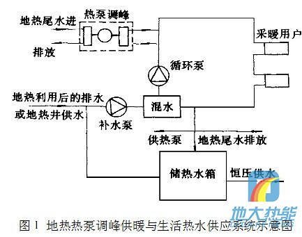 以往計算分析說明[:地熱熱泵供暖系統(tǒng),以地熱加熱泵調(diào)峰供暖方式的供暖成本和投 圖1地熱熱泵調(diào)峰供暖與生活熱水供應(yīng)系統(tǒng)示意圖資低于熱泵單獨作熱源的供暖方式。