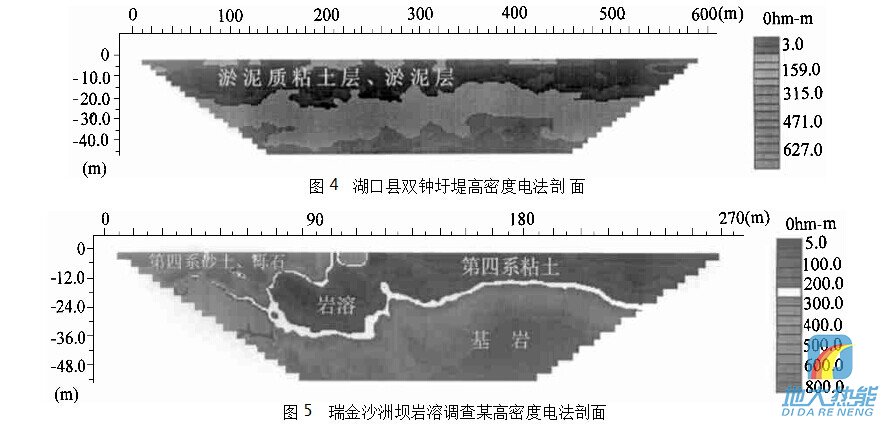 (3)高密度電法劃分地層 2000年4月初,在建中的湖口縣雙鐘圩堤部分堤段滑塌。事故發(fā)生后我院在該堤段進行了綜合物探勘察,為分析滑塌地質(zhì)原因提供了基礎(chǔ)地質(zhì)資料。雙鐘圩堤壩體填土層約7m,其下部為淤泥質(zhì)粘土層與淤泥層,淤泥層下部為泥盆系五通組砂巖。