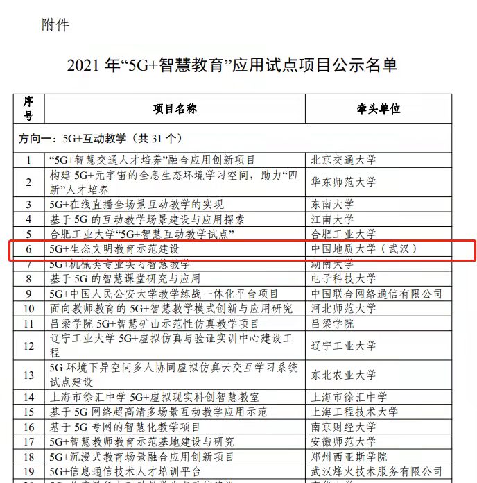 地大新聞網(wǎng)訊:近日,工業(yè)和信息化部、教育部聯(lián)合公示2021年“5G+智慧教育”應用試點項目入圍名單,我校牽頭申報的“5G+生態(tài)文明教育示范建設”項目成功入選。